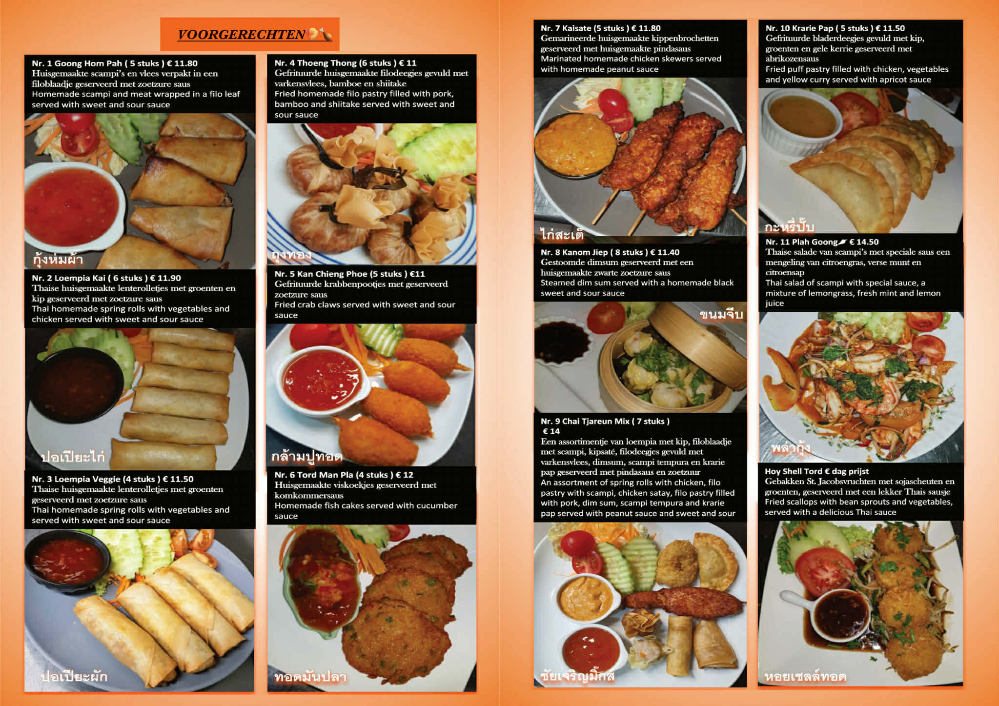 Nr. 1 Huisgemaakte scampi’s en vlees verpakt in een filoblaadje met zoetzure saus